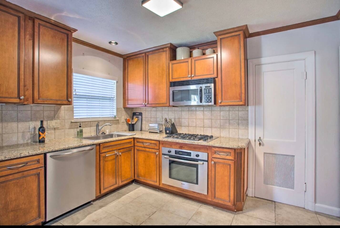Welcome to your beautifully renovated 1,250 sq ft home in Dallas! This 2-bedroom, 2-bathroom house is designed for comfort and style, featuring updated hardwood floors and sun-drenched living spaces. Relax in the cozy living room by the indoor fireplace, or stream your favorite shows on the Smart TV with included Netflix and Hulu. The kitchen is fully equipped with stainless steel appliances and granite countertops, perfect for preparing home-cooked meals. For those mixing work and travel, a dedicated workspace provides a quiet and convenient area to focus. The home comfortably sleeps up to 6 guests. The pullout sofa in the living room provides additional sleeping space for two, with clean linens and a comforter found in the master closet. An extra blanket is available in the woven basket by the sofa. Step outside to your private backyard, a perfect retreat for outdoor dining and relaxation. Fire up the gas and charcoal grill for a barbecue and enjoy your meal at the six-person dining table. Key Features: -High-speed WiFi -Full-size HE washer and dryer -Children’s books and toys